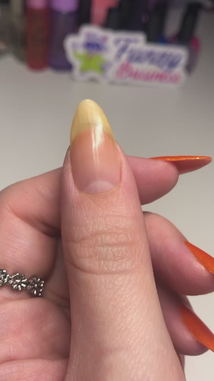 Nothing makes our blood boil like a meeting going over its allotted time, so in memorial of all the times things ran late, we created this traffic-cone-esque combination shade of orangey greatness. Multiple hues of shimmery orange mix together in an orange jelly base that may result in every meeting you have while wearing it magically ending on time.